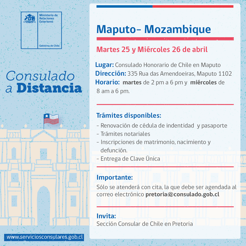 Los días 25 y 26 de abril, el Consulado de Chile en Pretoria, realizará un consulado a distancia en la ciudad de Maputo, Mozambique. Desde el año 2018 que no se realiza esta actividad en ese país.