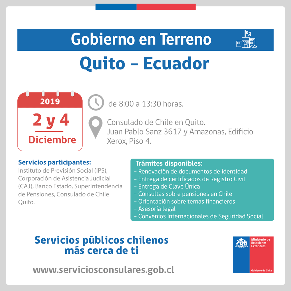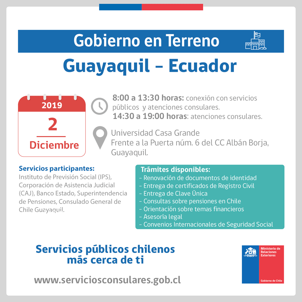 Los días 2 y 4 de diciembre, la Dirección para la Comunidad de Chilenos en el Exterior (DICOEX), junto al Consulado General de Chile en Guayaquil; realizarán la actividad Gobierno en Terreno Virtual. En esta oportunidad, los chilenos que asistan a la actividad en Guayaquil, Cuenca y Quito recibirán atenciones, por video conferencia, de profesionales de servicios públicos.