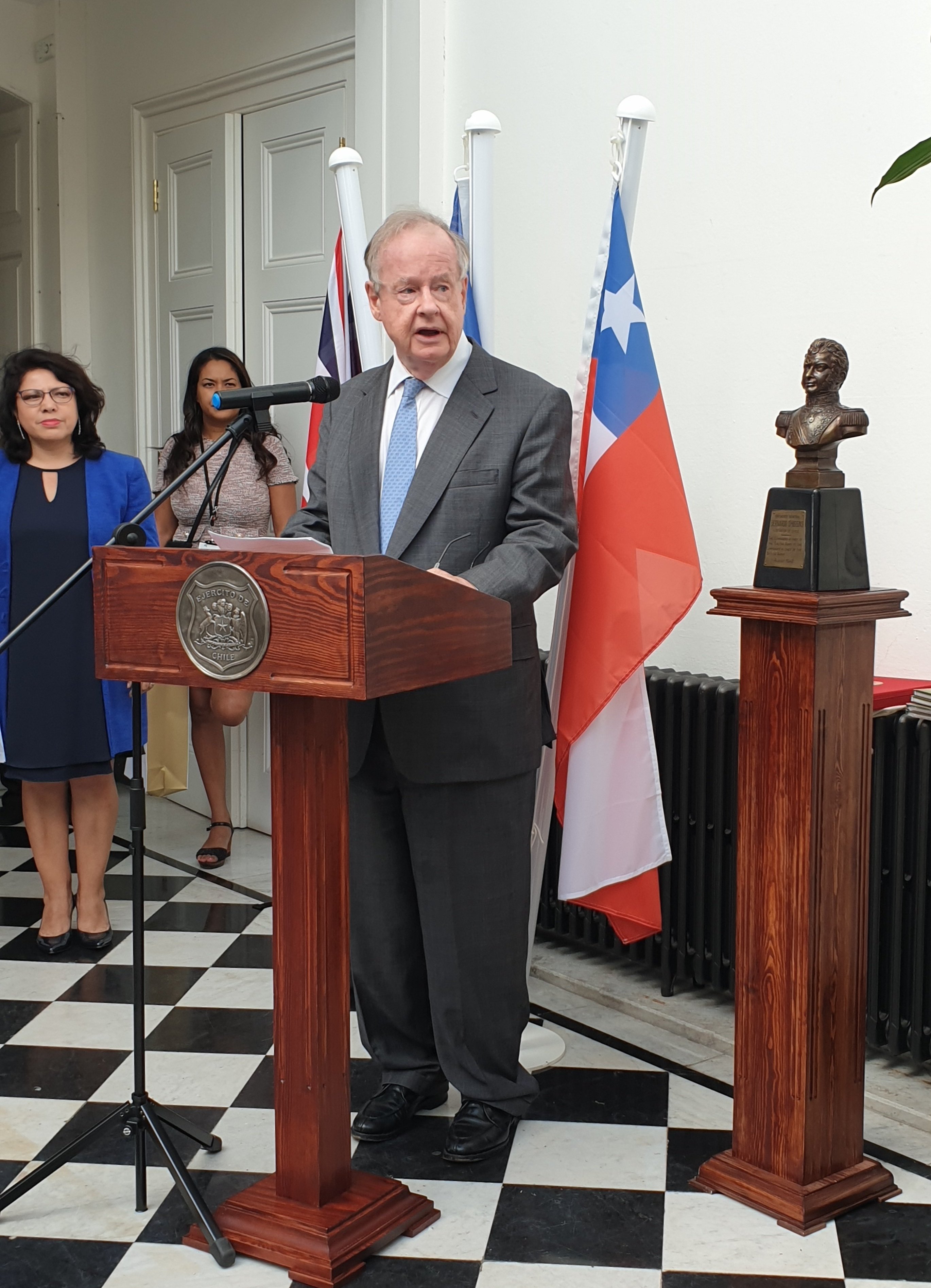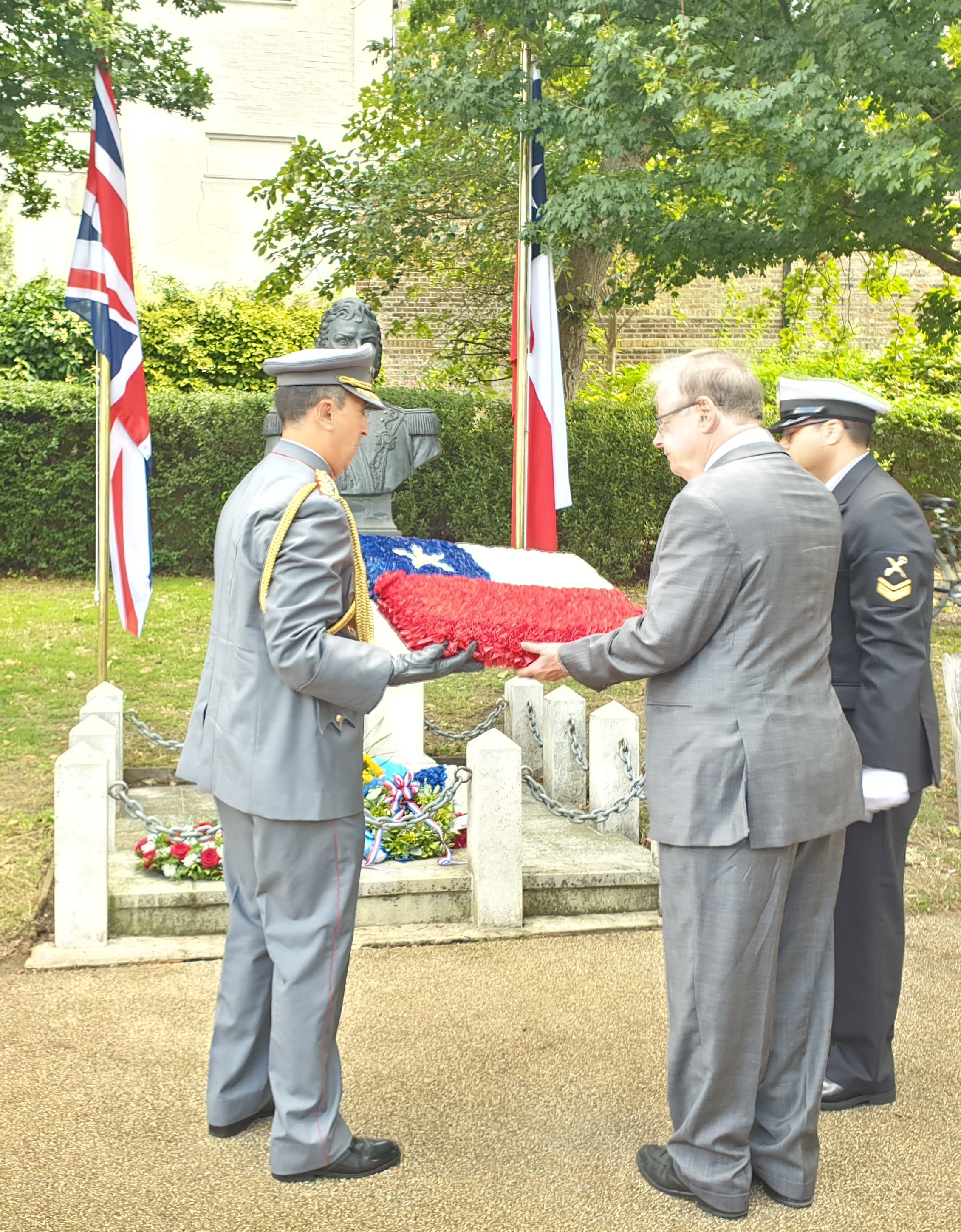 ![]() El Embajador David Gallagher y el Agregado Militar Coronel Sergio Gutierrez depositan una corona de flores en el busto de O'Higgins. |
