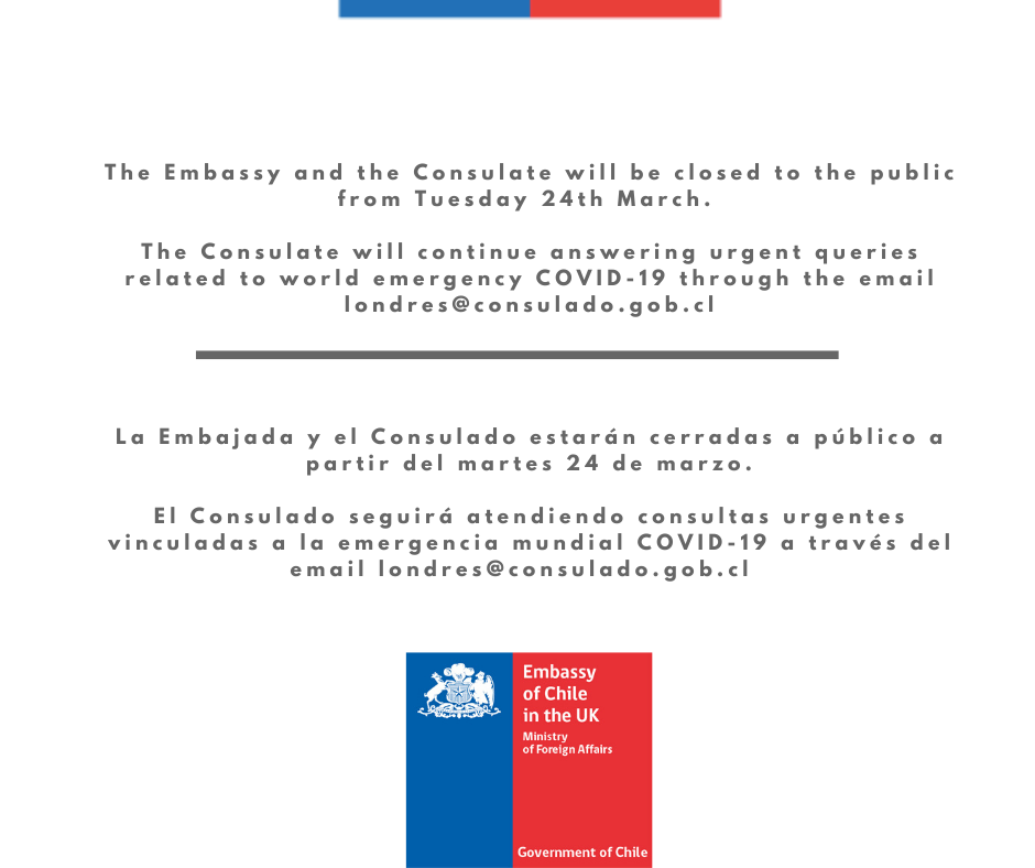 En razón de las instrucciones dadas a conocer por el Gobierno del Reino Unido, en el sentido de abstenerse de todos aquellos desplazamientos que no sean indispensables y aplicar un estricto distanciamiento social, como medidas para combatir la expansión del COVID-19, la Embajada de Chile en Reino Unido informa a los connacionales y público en general que la Embajada y el Consulado de Chile en Londres cierran sus puertas a público a partir del martes 24 de marzo.