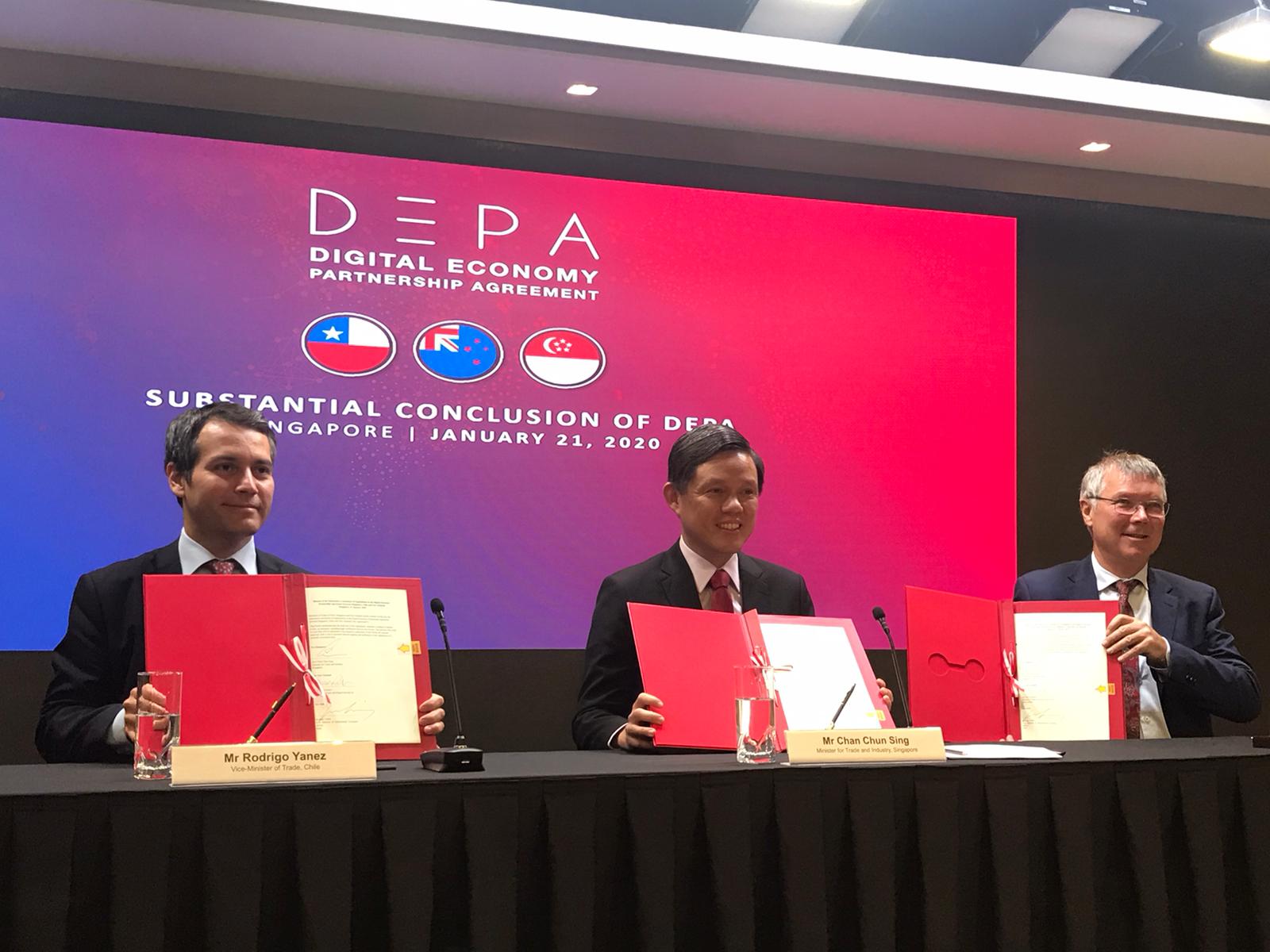 Hoy, Chile, junto a Nueva Zelandia y Singapur, cerraron las negociaciones del primer Acuerdo de Asociación sobre Economía Digital (DEPA, por su sigla en inglés), pionero de este tipo en el mundo. A la ceremonia asistieron el Subsecretario de Relaciones Económicas Internacionales, Rodrigo Yáñez, el Ministro de Comercio de Nueva Zelandia, David Parker, y el Ministro de Comercio e Industria de Singapur, Chan Chun Sing.