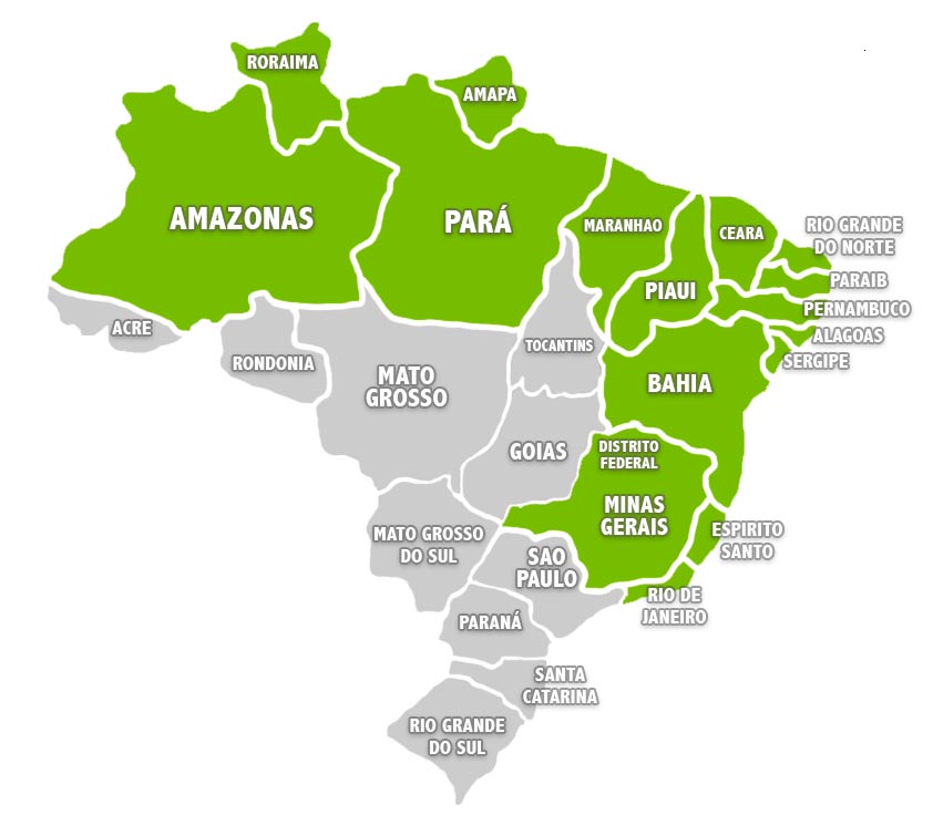 Río de Janeiro, Alagoas, Amapá, Amazonas, Bahía, Ceará, Espírito Santo, Maranhão, Minas Gerais, Pará, Paraíba, Pernambuco, Piauí, Río Grande do Norte, Roraima y Sergipe.