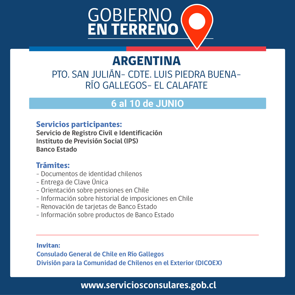 Acercar los servicios públicos a chilenos residentes en la provincia argentina de Santa Cruz, específicamente en las ciudades de Pto. San Julián, Cdte. Luis Piedra Buena, Río Gallegos y El Calafate, es el objetivo de la actividad Gobierno en Terreno, organizada por la División para la Comunidad de Chilenos en el Exterior (Dicoex) del Ministerio de Relaciones Exteriores y el Consulado General de Chile en Río Gallegos.