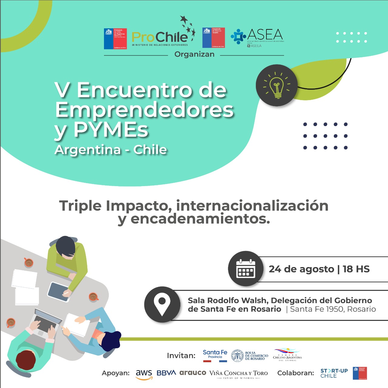 "El 24 de agosto de 2022 se realizará el "V Encuentro Emprendedores y Pymes Argentina-Chile: Triple Impacto, Internacionalización y Encadenamientos", para que empresas y emprendedores de Rosario conozcan las posibilidades de hacer negocios con Chile.