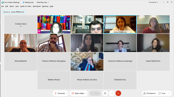 La Directora del Departamento de Relaciones Internacionales e Integración Europea del SNSPA, Sra. Ioana Melenciuc, también participó en la actividad, la que fue moderada por la profesora Sra. Ioana Dodi, y en donde asistieron además académicos y estudiantes del Máster en Estudios Internacionales del SNSPA.