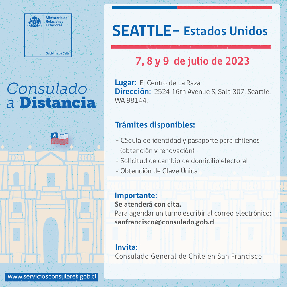 El Consulado General de Chile en San Francisco habilitó, desde el 7 al 9 de julio de 2023, un consulado a distancia en la ciudad de Seattle, Estados Unidos.