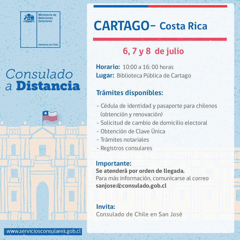 Entre los días 6 y 8 de julio del 2023, en la ciudad de Cartago, Costa Rica, el Consulado de Chile en San José realizará un Consulado a distancia.