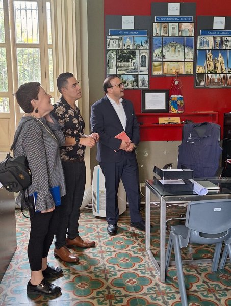 La embajadora María Soledad Morales realizó el 17 de febrero una visita al Palacio Tecleño de la Cultura y las Artes donde sostuvo una enriquecedora y distendida conversación con el alcalde de La Libertad Sur, Henry Flores, una oportunidad para entablar lazos de cooperación con el distrito de Santa Tecla.