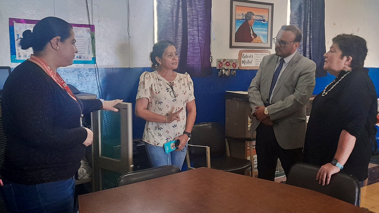 Los funcionarios fueron recibidos por un grupo de niños y niñas que ondeaban unas banderas de Chile, así como por la directora Claudia Patricia Romero y la maestra Katya Urbina, quienes brindaron un recorrido por la institución y conversaron sobre la situación de la escuela.