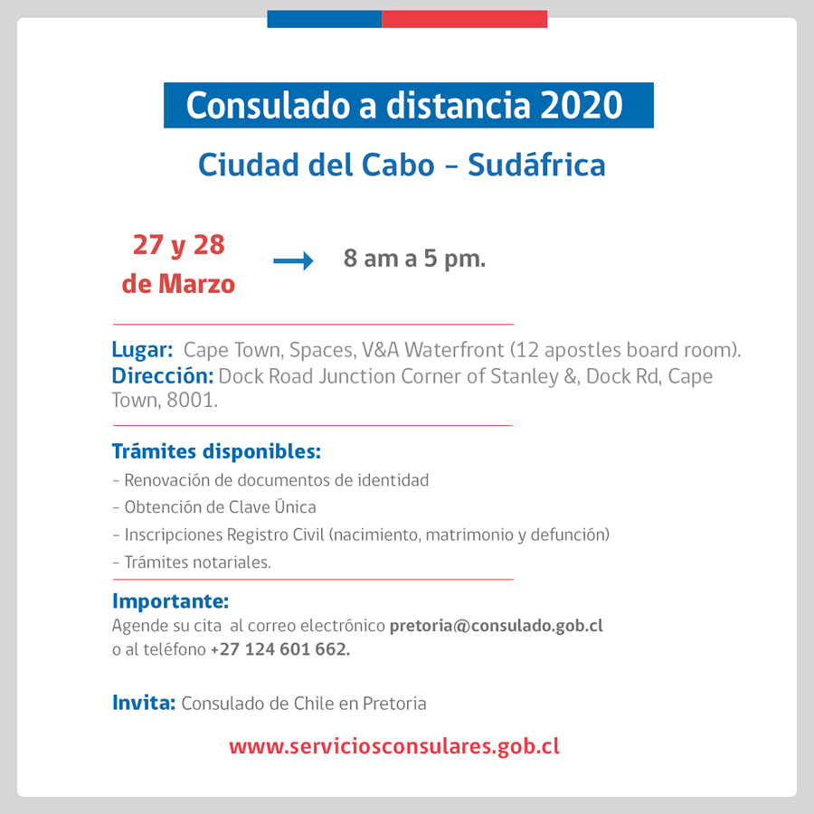 Entre el 27 y 28 de marzo, el Consulado de Chile en Pretoria realizará un Consulado a distancia en Ciudad del Cabo.