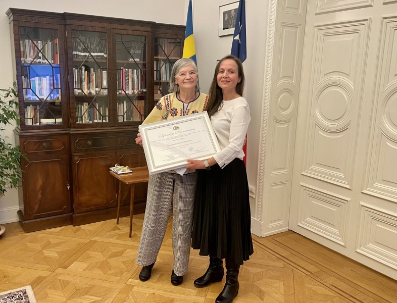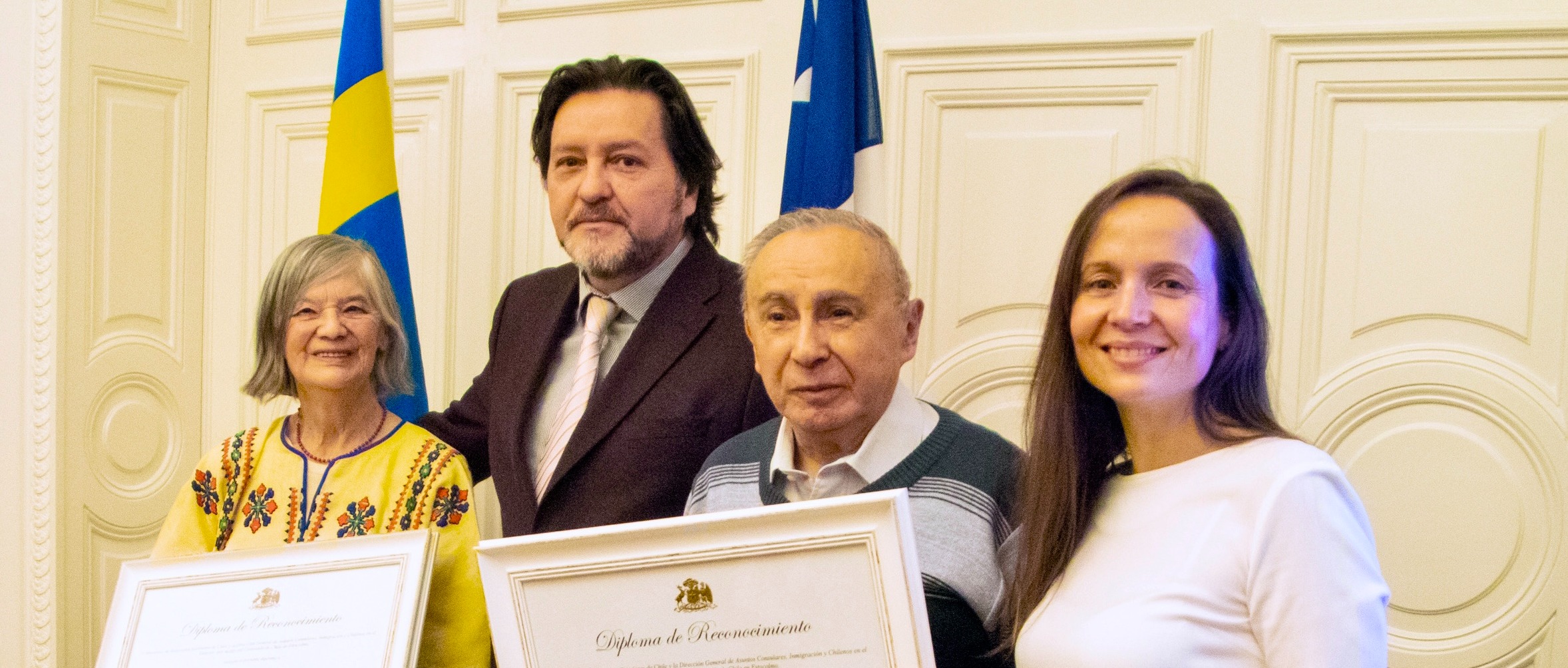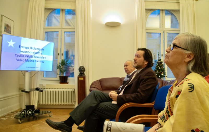 En una emotiva ceremonia realizada el 1 de diciembre en la Embajada de Chile en Suecia, y con la presencia del Embajador Tucapel Jiménez, la Cónsul en Estocolmo, Ana María Saldías, hizo entrega de un diploma de reconocimiento a dos compatriotas que se han destacado por su espíritu de servicio y aportes tanto a la comunidad chilena, como a la sociedad sueca: Cecilia Valdés y Vasco Molina.