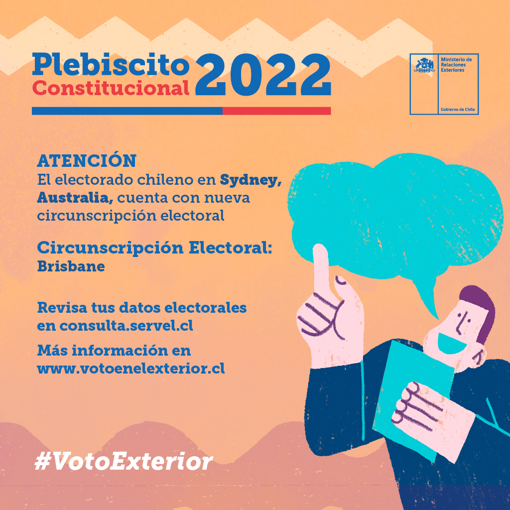Se informa a los electores chilenos residentes en Australia que se dispuso de una nueva circunscripción electoral en la ciudad de Brisbane, que comenzará a regir desde el Plebiscito Constitucional del domingo 4 de septiembre de 2022.