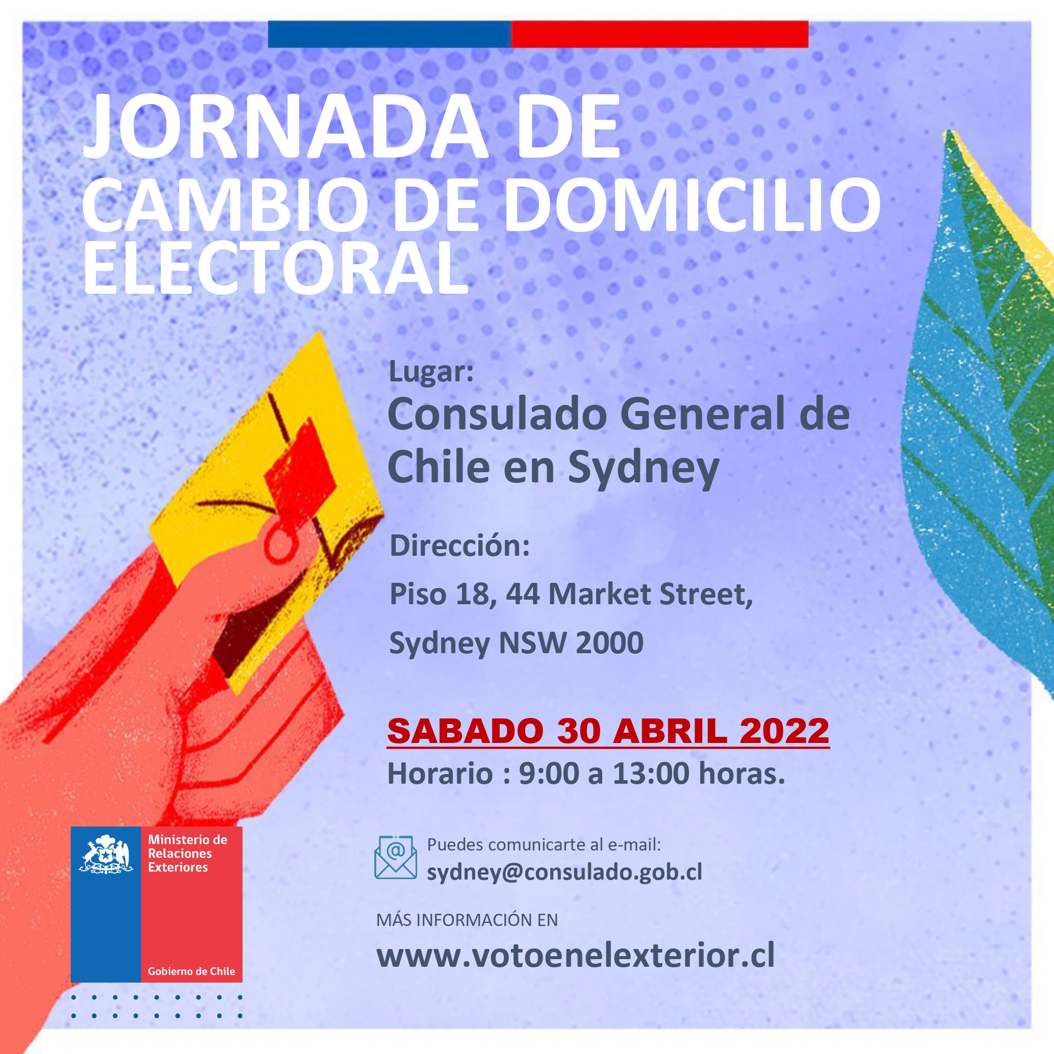 En el marco del Plebiscito Constitucional que se realizará el día 4 de septiembre, los connacionales en el exterior, interesados en votar, podrán realizar su cambio de domicilio electoral, de manera presencial, en una jornada extraordinaria el día sábado 30 de abril entre 9:00 y 14:00 horas.
