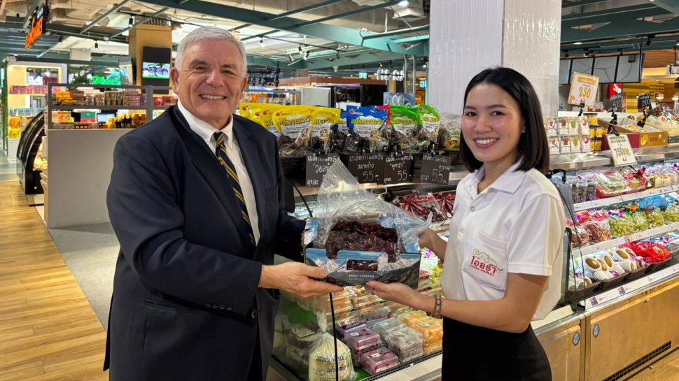 El 28 de Octubre el embajador de Chile ante el Reino de Tailandia, Patricio Powell, junto al funcionario David Hansen y los representantes de ProChile Bangkok, Agregado Comercial, Oscar Arriagada, y asistente comercial, Jitrapond Chaimee, visitaron una de las tiendas en Bangkok del importador de fruta Interfresh, quien puso en venta al público el primer cargamento de cerezas chilenas con destino a Tailandia de esta temporada.