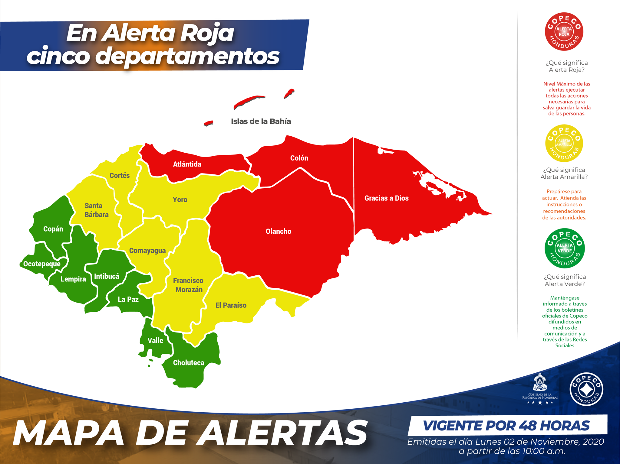 - Se ha declarado por 48 horas alerta roja en los departamento de Gracias a Dios, Colón, Atlántida, Islas de la Bahía y Olancho.