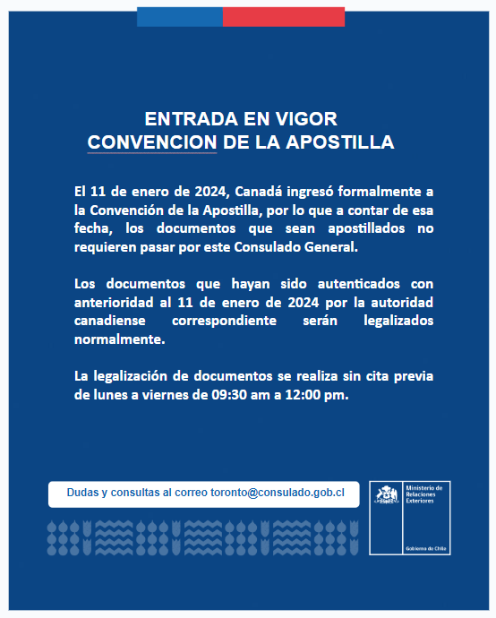 El 11 de enero de 2024, Canadá ingresó formalmente a la Convención de la Apostilla, por lo que a contar de esa fecha, los documentos que sean apostillados no requieren pasar por este Consulado General.