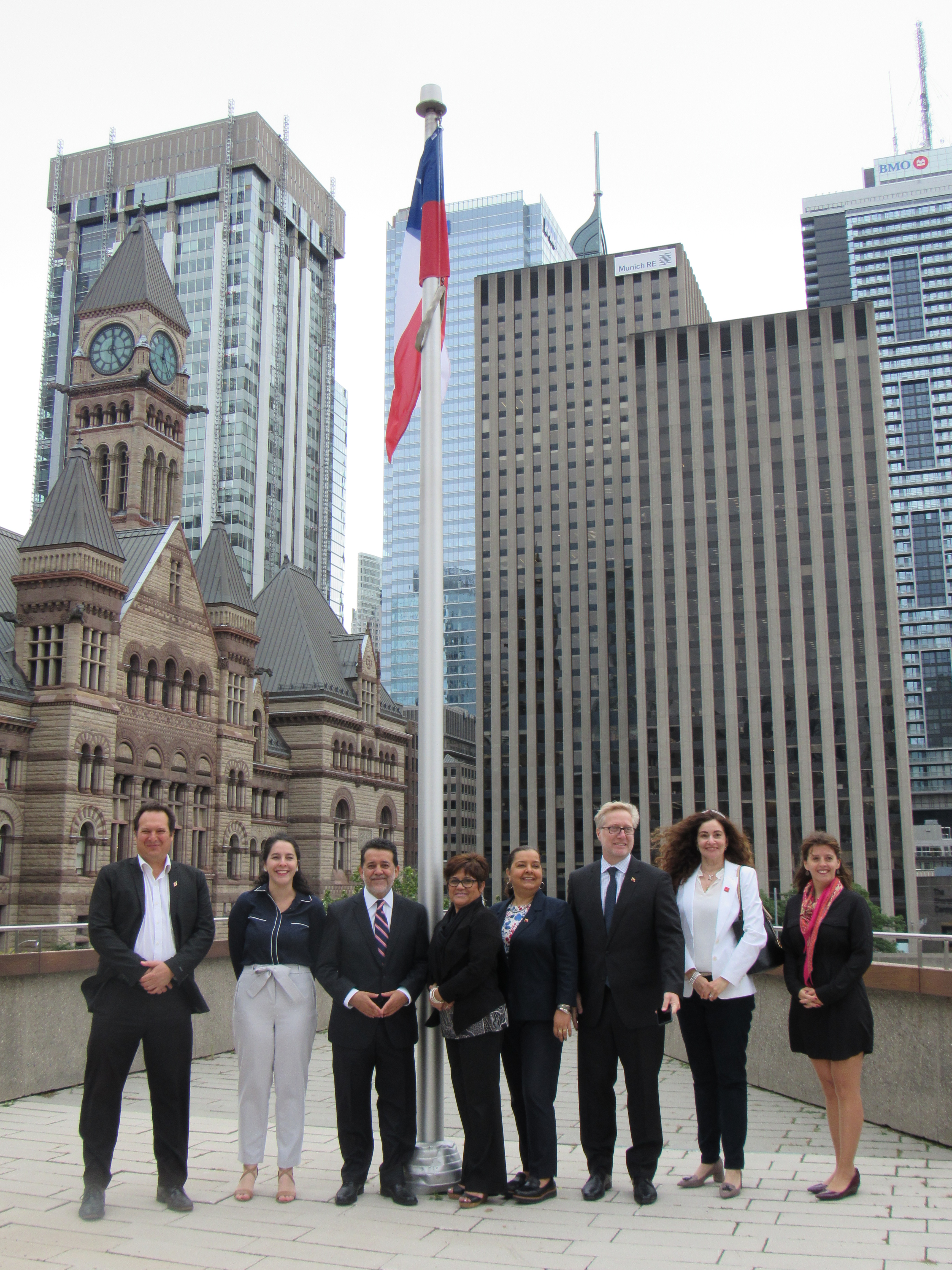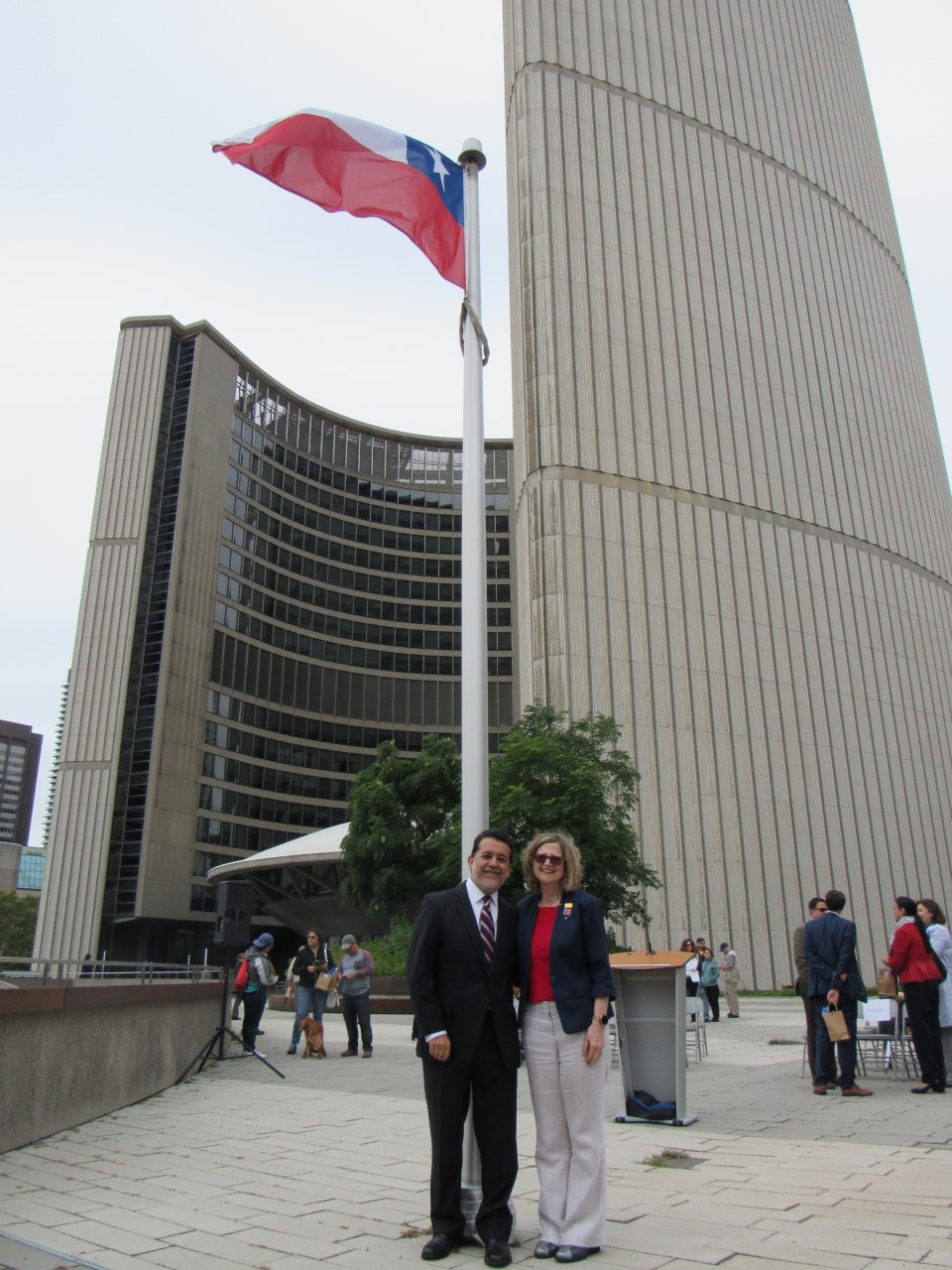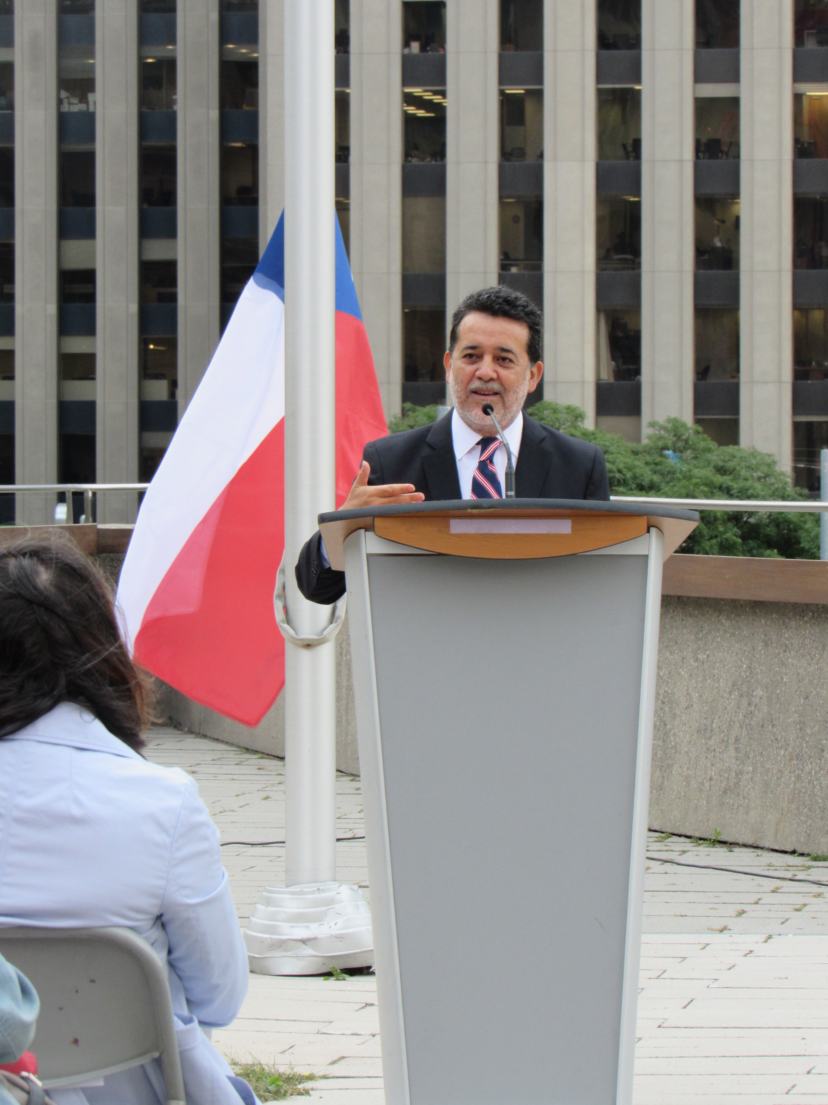 En el Podium Roof de la Municipalidad de la Ciudad de Toronto, hoy, 13 de septiembre, se realizó la ceremonia oficial de izamiento de nuestro pabellón nacional. Asistieron a este acto Cónsules Generales, representantes de la Municipalidad y de la comunidad chilena residente.