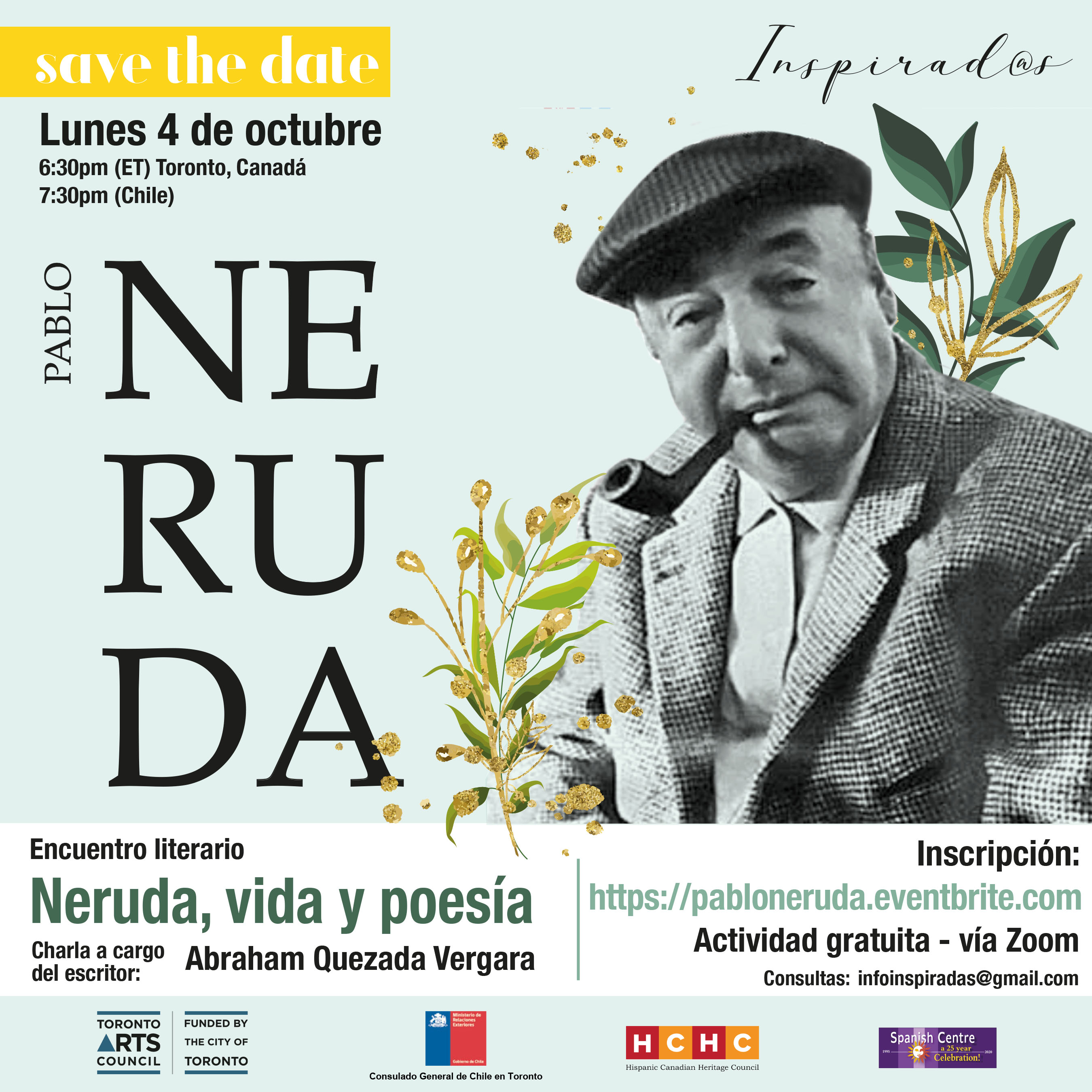 Los invitamos al encuentro literario "Neruda, vida y poesía" donde expondrá el escritor Abraham Quezada Vergara. La actividad se realizará de forma virtual el próximo lunes 4 de octubre a las 19:30 hrs. de Chile y 18:30 hrs. de Toronto. Para participar, deben inscribirse en el siguiente enlace. ¡No se lo pierdan!