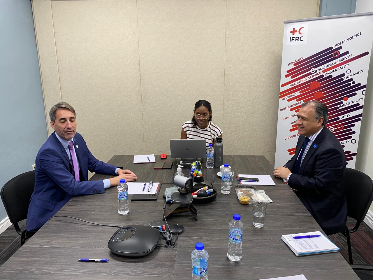 El lunes 12 de agosto, el Embajador Hernán Núñez sostuvo una reunión con el Jefe de la Delegación de la Federación Internacional de Sociedades de la Cruz Roja y de la Media Luna Roja (IFRC) en Trinidad y Tobago, Ariel Kestens, en el marco del aporte de USD 60.000 realizada por Chile en apoyo a tres de los países más afectados por el devastador paso del Huracán Beryl en el Caribe.