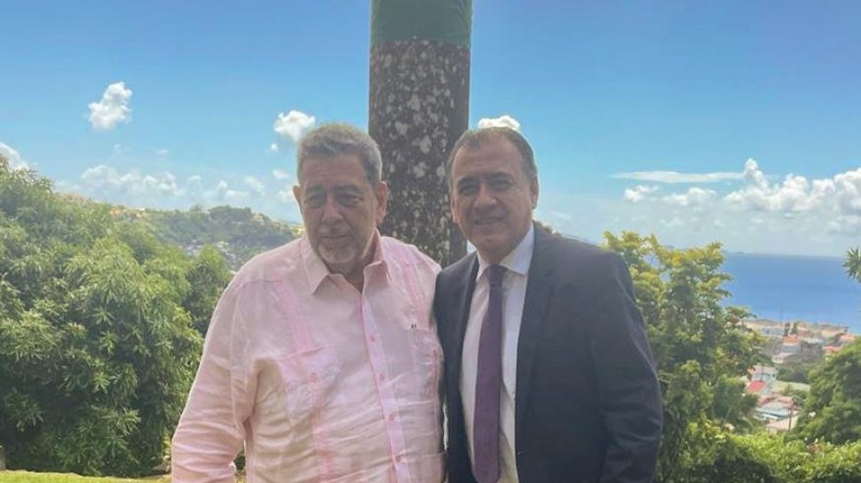 Embajador Núñez se reúne con PM Gonsalves en el marco del 45° aniversario de independencia de San Vicente y las Granadinas