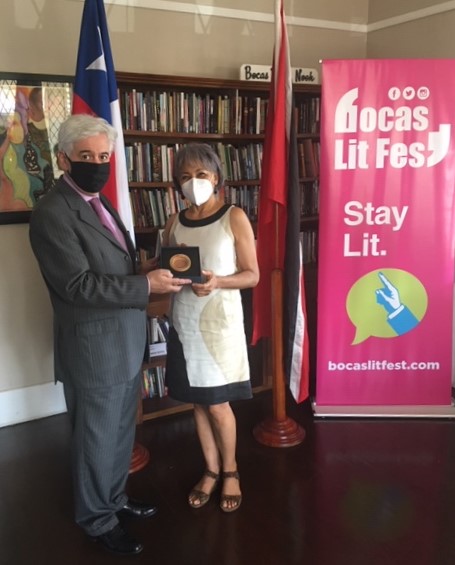 El Embajador Juan Barría entregó el premio conmemorativo de los 500 años del Estrecho de Magallanes a Marina Salandy Brown, destacada intelectual trinitense y creadora del Festival de Literatura de Trinidad y Tobago: Bocas Lit Fest.