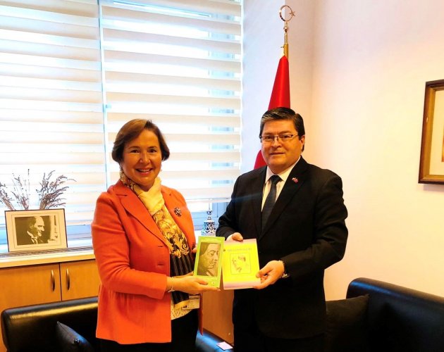 Asimismo, el Embajador le anunció la próxima donación de libros de Gabriela Mistral y otros poetas nacionales, la que complementa la realizada en noviembre pasado al proyecto coordinado por el Ministerio de Educación de Turquía y liderado por la esposa del Presidente de la República, Sra. Emine Erdogan, "No Schools without Libraries". Esta consistirá de una próxima entrega de 1.000 ejemplares de la nueva edición de los libros "Selección de Prosas y Poesías de Gabriela Mistral" y "Cuentos Chilenos", traducidos al turco por un grupo de profesores de la Universidad de Ankara, publicados gracias al apoyo de la Dirección de Asuntos Culturales del Ministerio de Relaciones Exteriores de Chile. El Libro de Gabriela Mistral se enmarca entre las actividades conmemorativas de los 100 años de la publicación de Desolación, mientras que el libro "Cuentos Chilenos", recoge más de 20 obras de diferentes escritores nacionales, entre ellos, Baldomero Lillo, Manuel Rojas, María Luisa Bombal, Francisco Coloane, Olegario Lazo, entre otros.