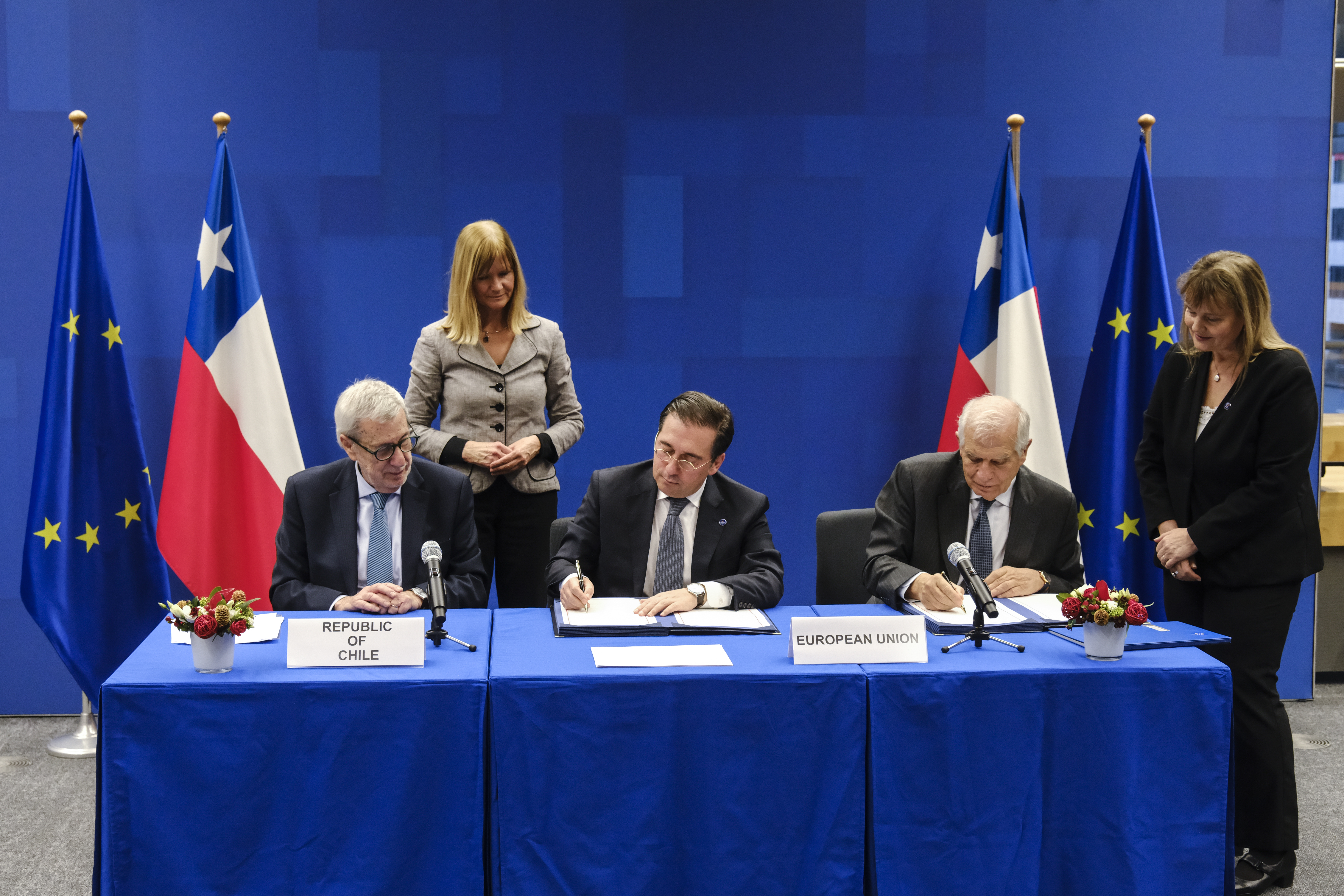 Por parte de Chile, firmó el ministro de Relaciones Exteriores, Alberto van Klaveren, mientras que por la Unión Europea lo hizo el ministro de Asuntos Exteriores, Unión Europea y Cooperación del Reino de España, José Manuel Albares, y el alto representante de la Unión para Asuntos Exteriores y Política de Seguridad y vicepresidente de la Comisión Europea, Josep Borrell.