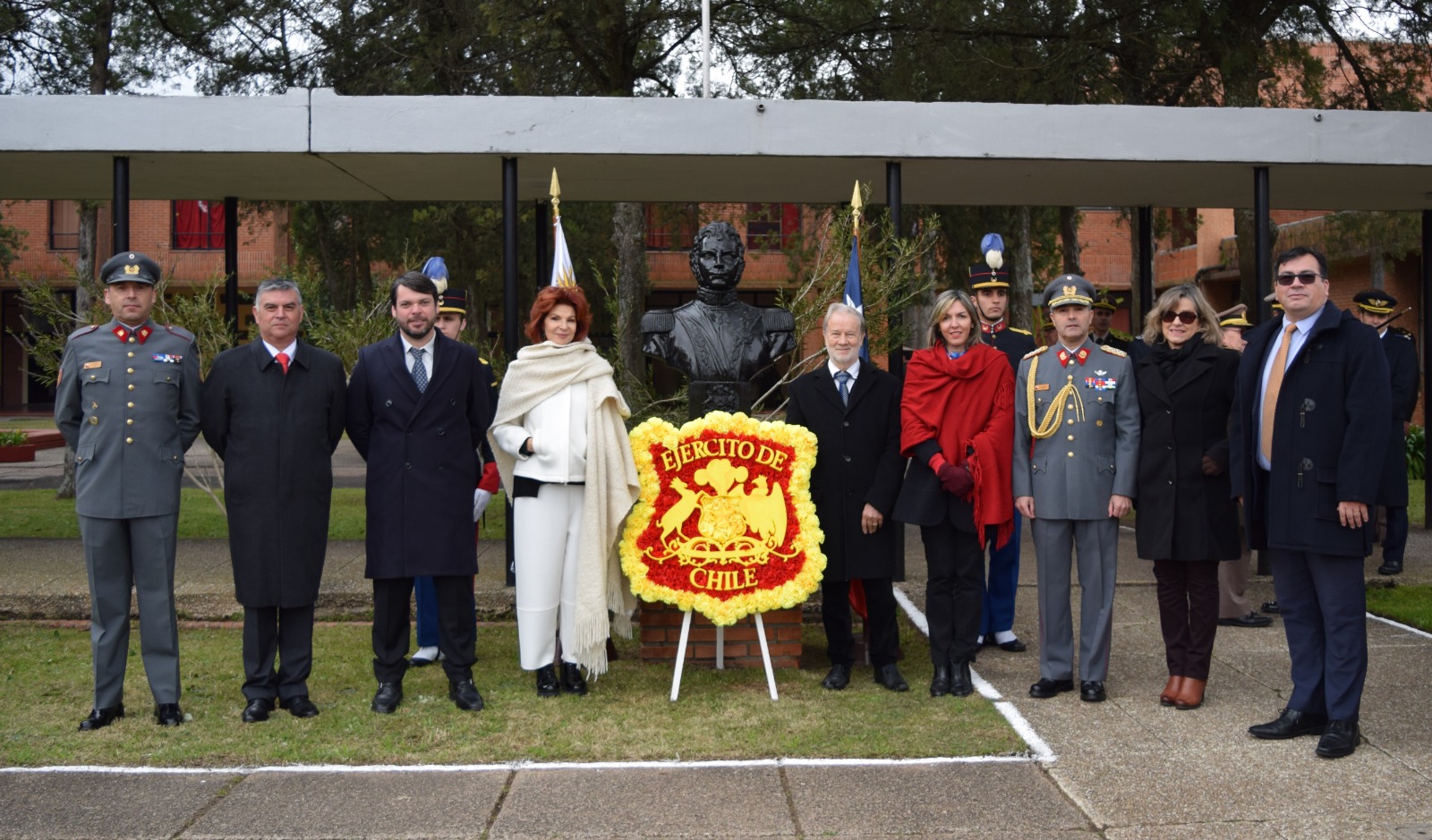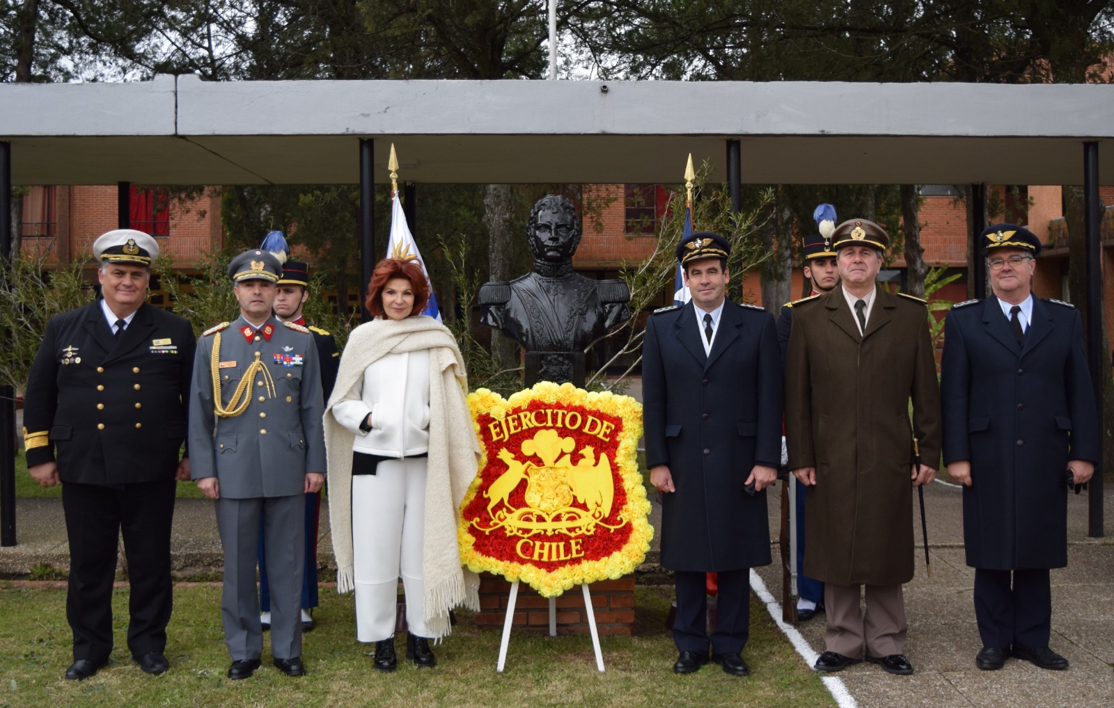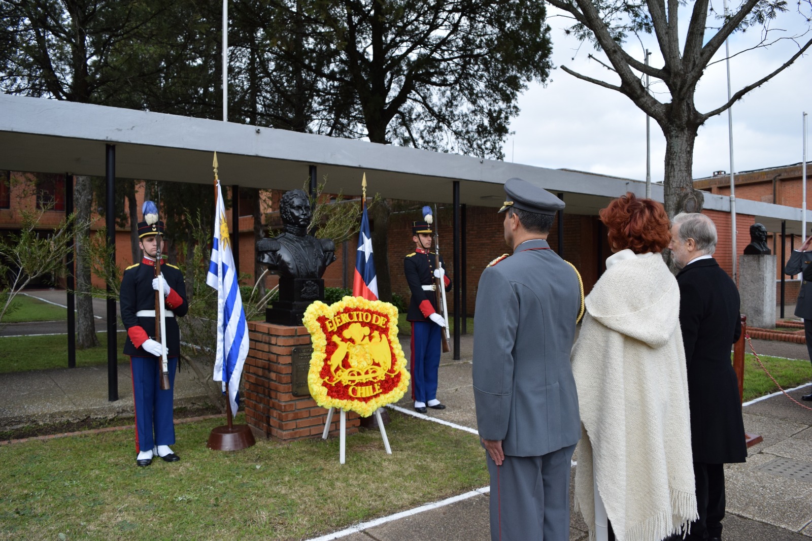 Se interpretaron los himnos nacionales de ambos Estados y se puso una ofrenda floral en el busto del prócer ubicado en el patio principal de dicha Escuela, por la Embajadora de Chile en Uruguay, Iris Boeninger, y el agregado de Defensa de Chile, Coronel Rafael Cabrera.