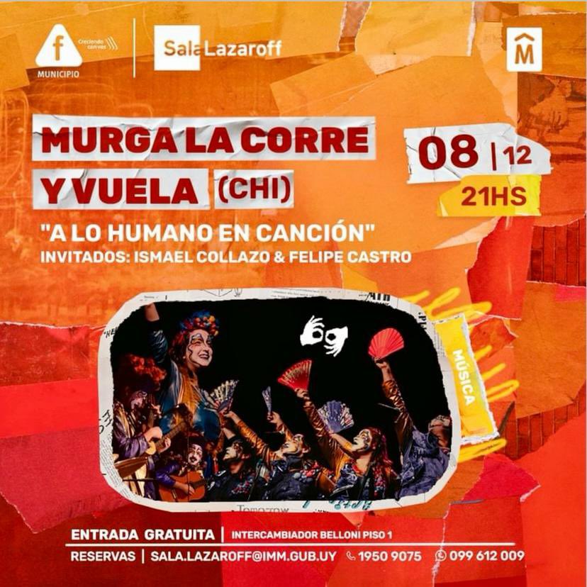 La Embajada de Chile en Uruguay, tiene el agrado de informar que en el marco de una gira por Montevideo, se presentará en la Sala Lazaroff la compañía chilena “Murga la Corre y Vuela”. El evento será el viernes 8 de diciembre a las 21 hrs.