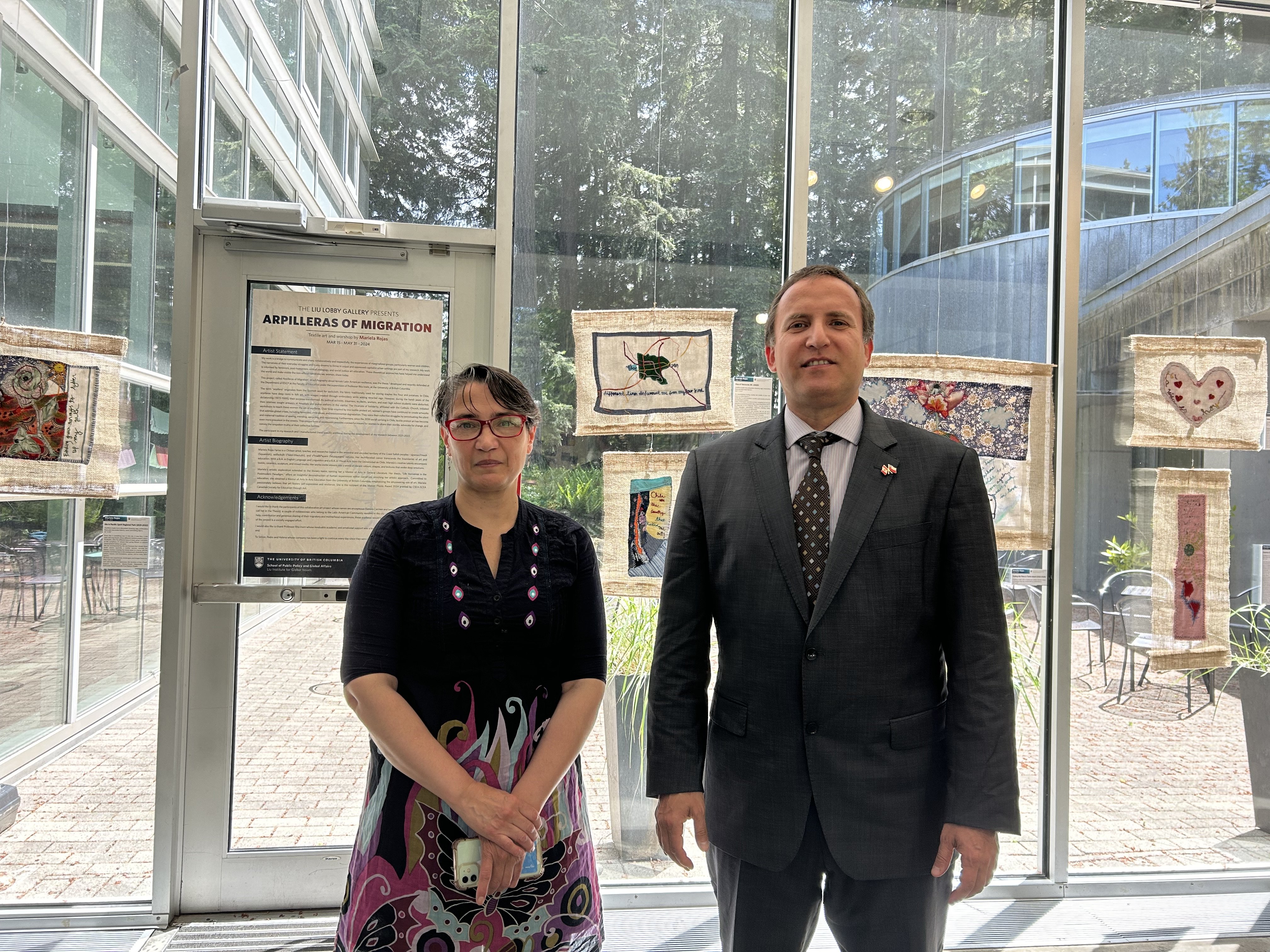 El cónsul General de Chile en Vancouver, Allan Najum, asistió a la exposición de arte textil Arpilleras de la Migración por la artista, investigadora y docente (a/r/tografa) chilena, Mariela Rojas en la Galería Liu del Instituto de Asuntos Globales de la Universidad de Columbia Británica (UBC)