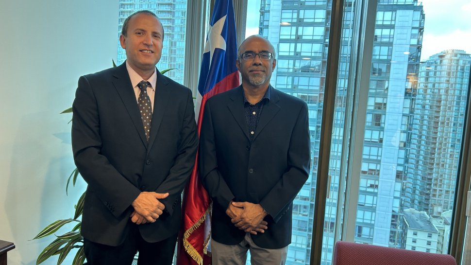El cónsul de Chile en Vancouver, Allan Najum, se reunió con el profesor y premio nacional 3M a la enseñanza, Dr. A.R. Elangovan, vicepresidente asociado, Global Engagement de la Universidad de Victoria.