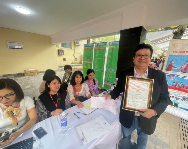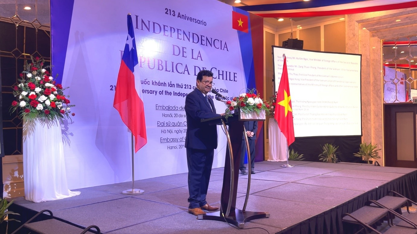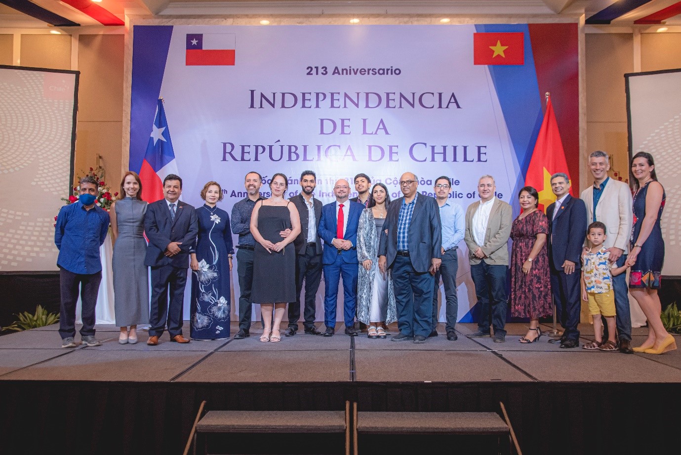 La Embajada de Chile en Vietnam celebró en Hanói el 213 Aniversario de la Independencia de Chile junto con 120 invitados, entre ellos, autoridades vietnamitas, ex embajadores de Vietnam en Chile, embajadores y representantes del cuerpo diplomático, empresarios, estudiantes de la Academia Diplomática de Vietnam y otras personalidades. En este marco el Embajador Sergio Narea destacó el excelente estado de las relaciones bilaterales con Vietnam, sus hitos históricos y diplomáticos, así como la cooperación que impulsan mecanismos regionales y multilaterales, tales como APEC, ASEAN y la Comisión de DDHH de Naciones Unidas. Un momento especial fue dedicado a la comunidad de chilenos residentes invitada por primera vez en muchos años al acto de conmemoración junto con sus familias, en que se vio el saludo de SE el Presidente de la República a los chilenos en el exterior.