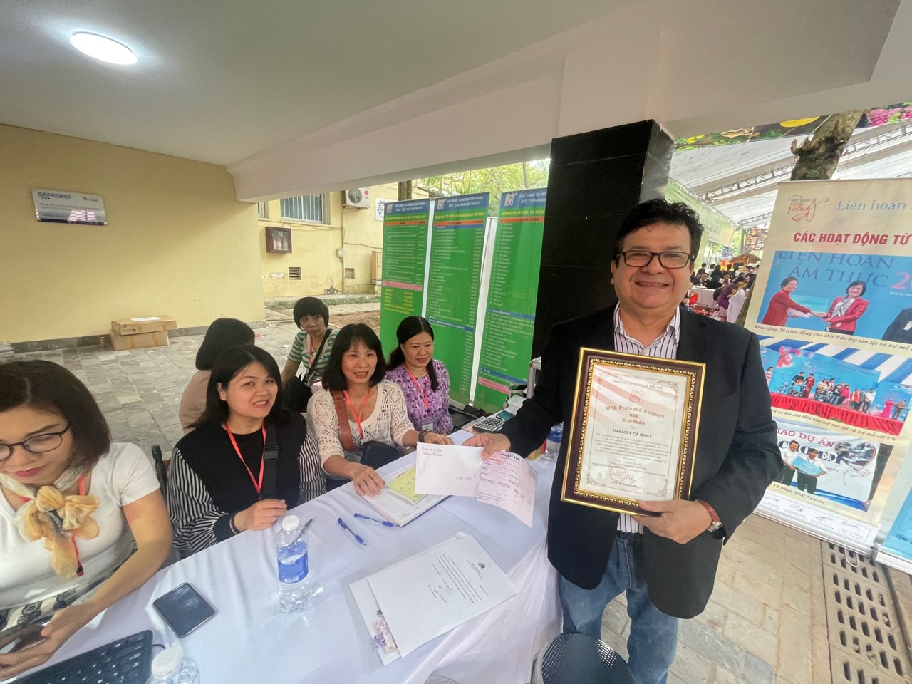El stand de Chile contó con empanadas de pino y vino tinto chileno, todo lo cual fue vendido con éxito a las familias vietnamitas que asistieron a la actividad.