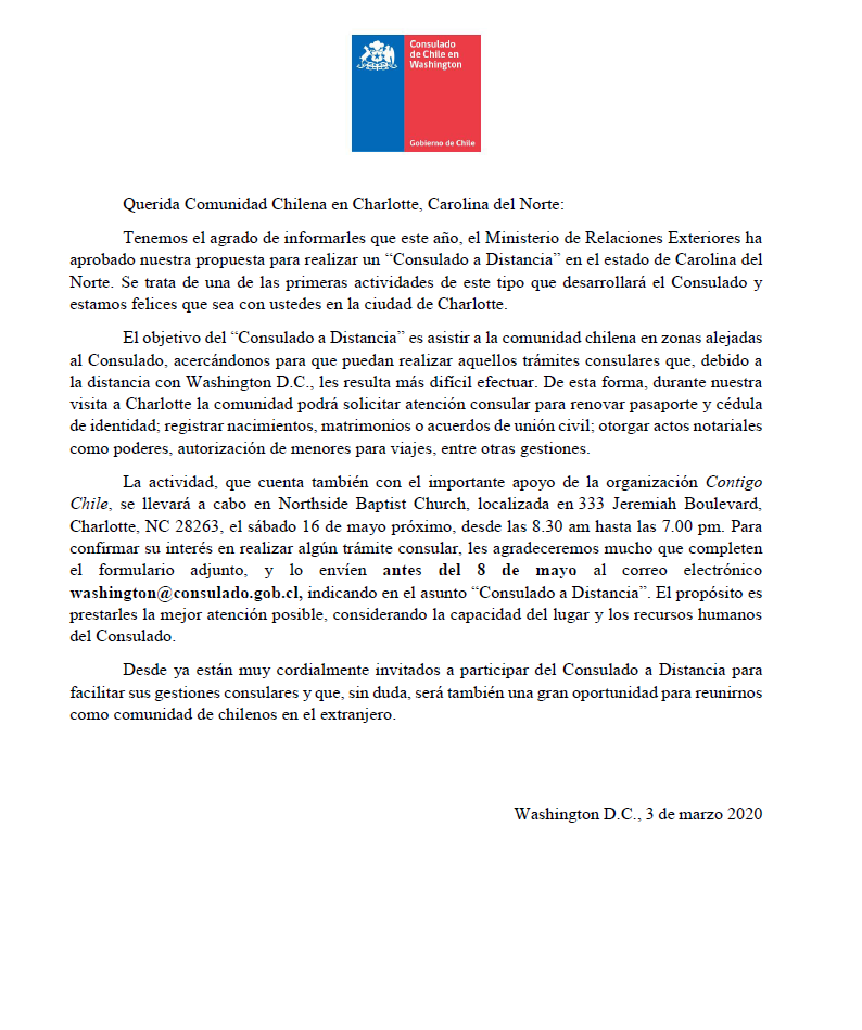 SUSPENDIDO | Consulado a Distancia en Charlotte: inscripción de trámites hasta el 8 de mayo Comparte Síguenos A+ A- SUSPENDIDO. Más información aquí. Pueden descargar el formulario aquí.