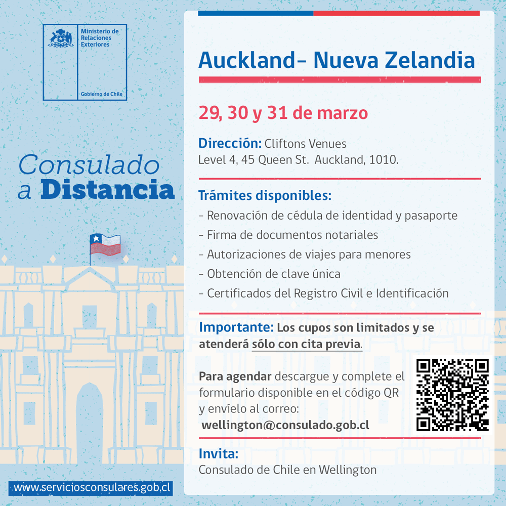 Los días 29, 30 y 31 de marzo, el Consulado de Chile en Wellington, Nueva Zelandia, se trasladará hasta la ciudad de Auckland para llevar a cabo un consulado a distancia.